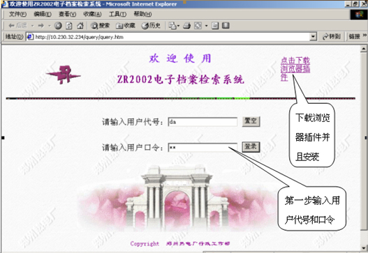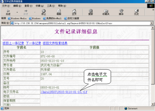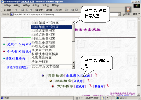输入IP地址:“10.230.32.234”进入我厂档案信息网主页,点击“档案查询”后出现如下界面:
