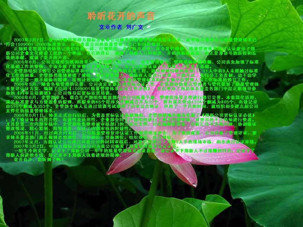 3月2日,我公司顺利取得方圆标志认证公司颁发的质量管理体系认证证书。此举标志着我公司质量管理体系已符合ISO9001:2000标准要求,标志着我公司的质量管理工作已和国际接轨。 正如鲜花怒放时的娇艳让我们欣慰一样,仔细聆听,花开的声音也一样令我们感动。质量管理体系通过认证展示了郑新公司企业文化建设工程的一个侧面,在它的背后,凝聚了郑新人与时俱进、开拓创新的探索。也正是那奋斗的历程和忘我的奉献,成就了花开的声音。 2005年6月,公司完成组织机构改革与全员竞聘上岗工作后,诸多管理职责、管理事项亟需理顺,公司首先加强了标准化基础工作的整顿,全面开展了复审修订企业标准工作,为公司贯标认证工作的深入开展奠定基础。 企管部组织了修订公司管理标准和中层人员工作标准的系统工程。面对刚刚组建的新部门,11人中有9人未接触过标准化工作的困难,企管部勇敢地迎接了挑战,他们群策群力、将所有人员进行培训、内部考试,实行分工负责制、边干边学,硬是凭着一股不服输的精神,按照计划完成了公司130多项的管理标准和80多项中层管理人员工作标准的修订工作。 2006年5月,随着各项管理的完善,公司决定重新启动贯标认证工作,企管部协助最高管理者与管代策划了质量管理体系复评认证方案,编制了公司《ISO9001质量管理体系认证工作计划》,先后举办了包括体系覆盖各部门中层正职领导参加的《内审员培训班》、公司领导层贯标宣贯培训。 2006年6月,企管部牵头,联合生产部组织职能部门对公司质量手册、管理程序等文件进行修订完善。本着简化适用、满足标准要求与方便操作的原则,将原来的45个程序文件删减合并为22个,将有效文件由1104个删减为485个,有效记录由510个删减为353个。企管部全体人员通过培训考试取得了内审员合格证,只用了一个月的时间,就组织初步建立起公司文件化的质量管理体系。 2006年8月1日,体系正式运行以后,为普及贯标认证基础知识,企管部修编并颁布实施了《郑新公司贯标认证必读》;为了验证体系的符合性、有效性及适用性,企业部会同生产部组织进行了两次内部审核,对查出的不合格项进行整改。尤其是第二次内部审核中,企管部收集整理被审核部门的三层次文件,讨论编制检查表,分析汇总不合格问题,协调验证整改情况,精心筹划,周密部署,保证了内部审核的时效性。 2006年11月,经过两次内审后,公司质量管理复评认证工作取得明显进步,为了巩固成果,公司开展了管理评审,要求体系覆盖部门真正做到思想到位、责任到位、措施到位、组织到位,执行到位。 2007年元月,方圆认证公司通过对我公司的材料审核后,对我公司进行了为期3天半的现场审核,初步通过认证审核。 2007年3月2日,中国方圆标志认证公司为我公司颁发了质量管理体系认证证书。 一组生冷的文字,记录下了郑新公司一年半的质量管理体系认证历程,却记录不下郑新人不计报酬的付出;记录下了郑新人前进的步伐,却记录不下郑新人执着进取的精神。 花开有声,您听到了吗?