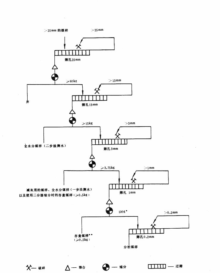* 煤样制备的全过程如一直使用二分器缩分,可从小于3mm的煤样中直接缩分出100g用于制备分析煤样,而不经过1mm的步骤。缩分至3.75kg时,务必使这部分全部通过3mm圆孔筛后再进行缩分。