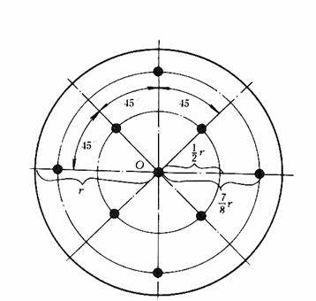 3.9.2 除使用一次就能缩分出测定全水分所需数量的煤样的缩分机外,煤样破碎到规定粒度,稍加混合,摊平后用九点法(布点如图3)缩分。全水分煤样的制备要迅 速。