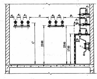 关于手车式开关柜的通道宽度,不少运行单位反映,认为原规程数值偏小,根据目前各单位进行设备大修时的情况,将最小宽度放大至单车长+1200mm及双车长+900mm。这两种尺寸与“厂用电设计技术规定”中手车式高压开关柜操作通道的最小宽度是一致的。该规定单列布置最小宽度为2000mm,双列布置为2500mm,而小车长度为800mm,分别加上1200及900mm后,其最小宽度也是2000及2500mm。