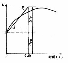又称励磁电压平均上升速度,VE的计算是在0.5s内保持电压上升速度不变,即用直线代替实际上升曲线,使面积A=面积B,如图2所示。此时,