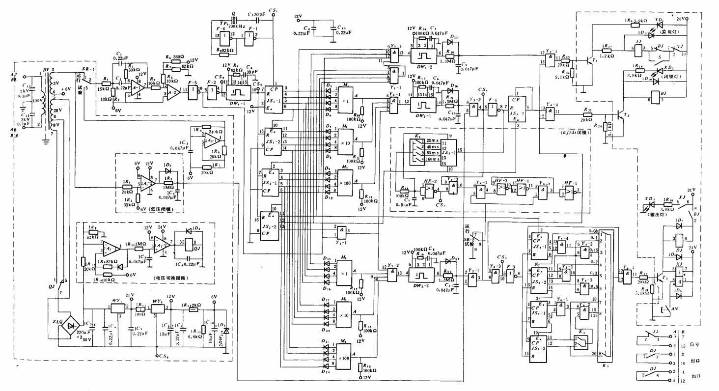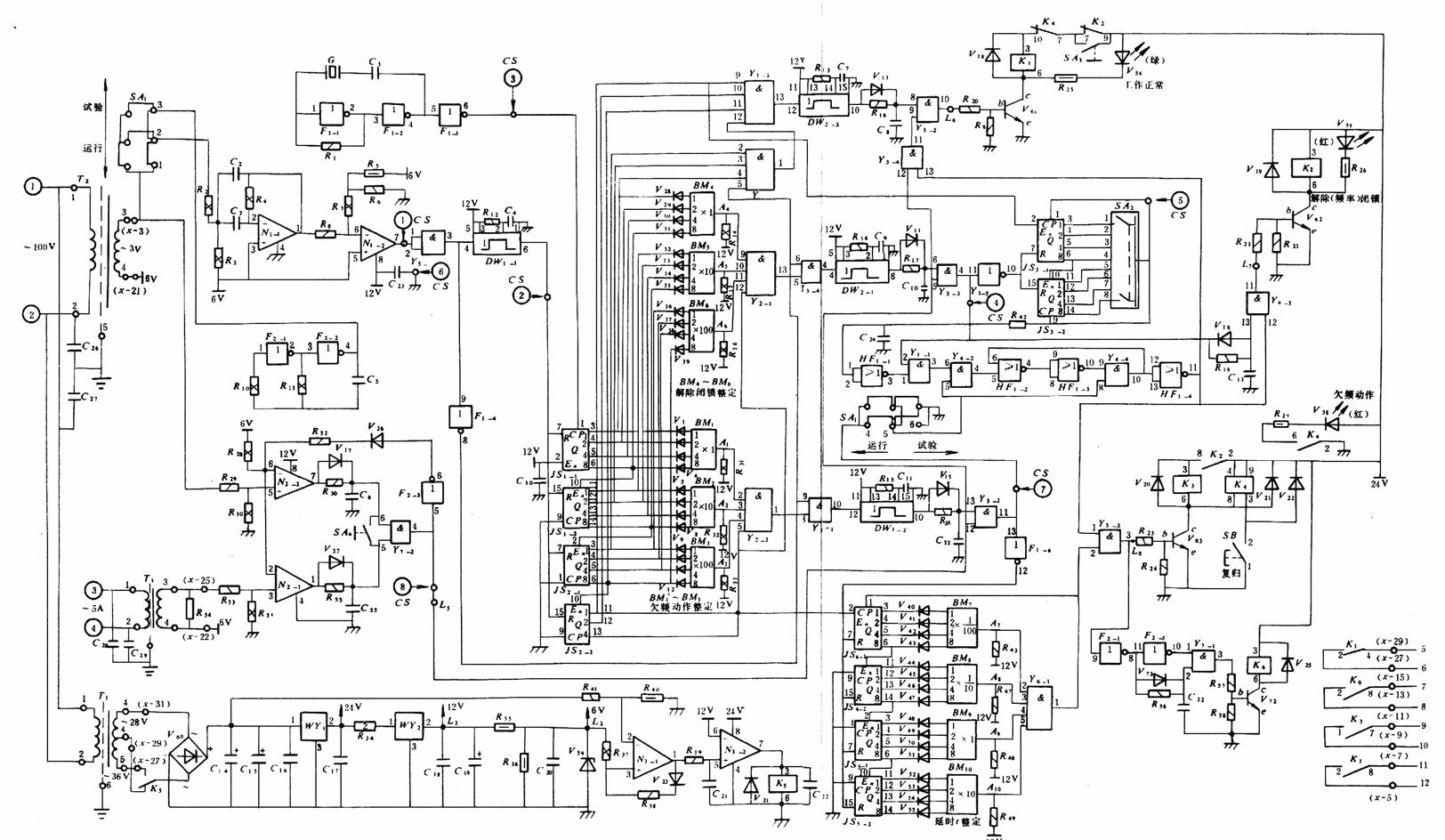 试验切换开关SK有两个位置,当放在“运行”位置时,频率测量回路经SK触点接在隔离变压器次级绕组上,即测量交流输入电压回路的频率。在放在“试验”位置时,将频率测量回路改接到试验用工频电源发生器的输出端,此时三个测量级均应动作。对SZH-2型继电器SK还有另外一付转换触点,在“试验”位置时,断开频率输出级至df/dt闭锁电路,并将与门Y4-2及Y4-4的一个输入端接地,从而把df/dt闭锁回路解除。
