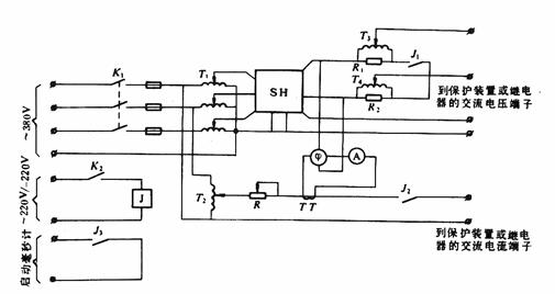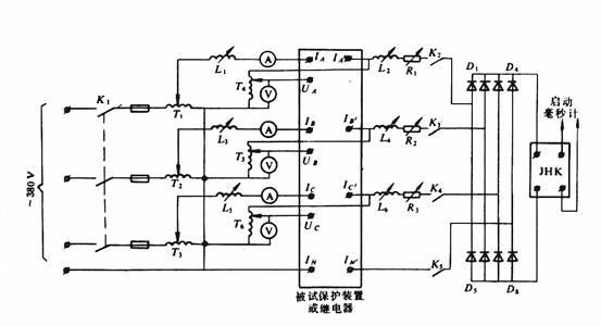 该试验电路具有模拟三相、二相、二相接地和单相接地短路的功能,且能控制短路合闸角,适宜于测试电流元件、阻抗元件受直流分量影响的暂态超越,电流突变量元件、负序零序电流增量元件、阻抗元件和整套保护装置的刻度值、动作特性和动作时间。