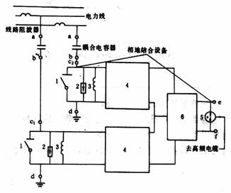 1—接地刀闸;2—主避雷器;3—排流线圈;4—调谐元件(包括匹配变量器);5—副避雷器;6—平衡变量器;