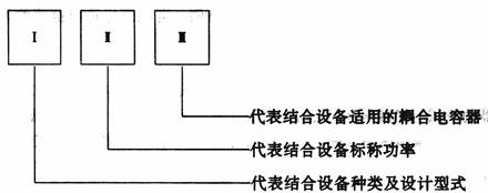 结合设备的型号,由表征结合设备结构特征的汉语拼音字母和表征结合设备适用范围的数字组成,一般包括3部分。通常第1部分代表结合设备的种类及设计型式,第2部分代表标称功率,第3部分代表耦合电容器电容量。第1~3部分需用连字符号分开。