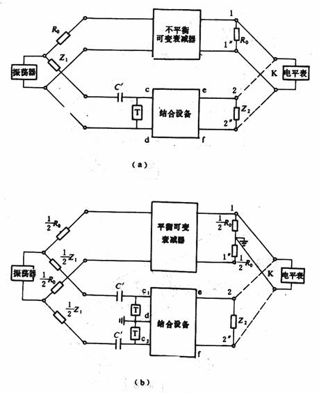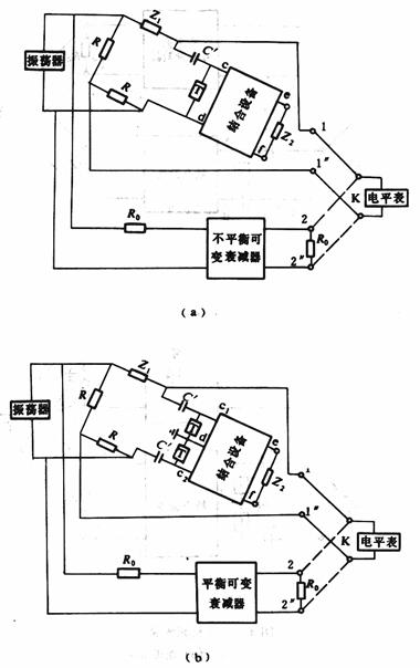 在结合设备的次级端子接两台振荡器,其输出信号的频率不同但都位于结合设备工作频带以内。结合设备的初级端子通过测试电容器接一个阻值等于线路侧标称阻抗的无感电阻。两台振荡器的信号电压相等,在电阻两端各可产生1/4的峰值包络功率,以有效带宽不超过300Hz的选频电平表测出其任一种失真和交调产物。试验应尽量准确地模拟结合设备工作时的运行条件,包括正常工作时通过结合设备的工频电流及考虑耦合电容器低电压端的杂散电容及杂散电导的影响。