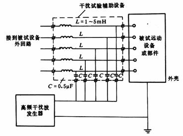 试验电路如图A1所示,对被试设备施加额定电压的电源,当对某回路进行干扰试验时,应将电感L串入该输入(输出或电源)回路的外回路中。此处所指的外回路,是模拟3.8.2.2所指的外部回路。高频干扰波通过电容C加于设备被试回路与外壳之间,外壳应接地。