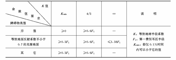 3.2.1 微波电路的每一个接力段,在所考虑的K值变化的时间范围内,电波射束和障碍物之间应留有足够的余隙值,以保证能量的有效传输。表3.2.1的余隙值标准是根据在所考虑K值变化的时间内,障碍物的绕射损耗或反射引起的接收电平值下降不大于10dB为基础的。