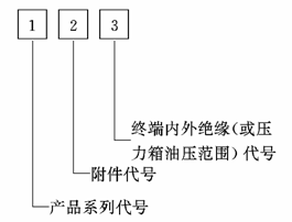 3.2.2 附件型号由电缆产品系列代号,附件代号及终端内外绝缘(或压力箱油压范围)代号组成,产品用型号、规格(额定电压、适用电缆截面或供油量)及标准号表示,其结构示意如下: