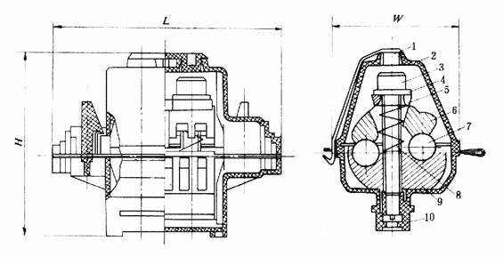 6—线夹动块;7—架空绝缘电线;8—弹簧;9—线夹定块;10—绝缘盒底
