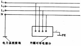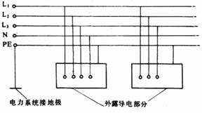 4.1.1 TN—S接地系统的PE线正常情况下不通过负荷电流,所以PE线和设备外壳正常不带电,只在发生接地故障时才有电位,因此,在施工现场采用较为安全。但有些施工现场供电范围较大,较分散,电源引出5根线有一定困难,且线路长,阻抗大,采用TN—S系统问题较多,因而应采用TT系统,电气设备外壳直接与接地极连接。