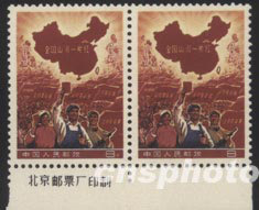 北京一名老工人1968年精心收藏的“全国山河一片红”撤销发行邮票横双联,带完整下边纸及厂名,在七月十二日华辰春季拍卖会上估价三十五万元人民币。中新社记者:贾国荣