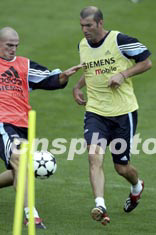 西班牙皇家马德里足球队二十六日下午在昆明冒雨训练,齐达内表演娴熟的盘带过人技巧。