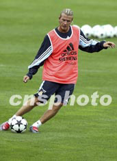 西班牙皇家马德里足球队二十六日下午在昆明冒雨训练,贝克汉姆渐入状态,展示他的脚下传世神功。