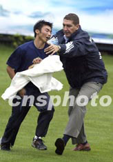 一名在昆明观看西班牙皇家马德里足球队二十六日下午在的训练的狂热球迷跳入场中,口中呼喊着劳尔的名字,希望得到签名,被及时赶来的工作人员阻止。