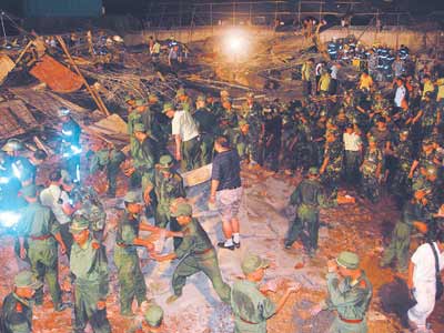 救援现场 南方网讯 8月9日晚6时左右,位于厦门市湖里区湖边水库附近的一个在建厂房发生坍塌,在厂施工的80余名工人被压,据中央电视台报道,目前确认有5名工人死亡。 8月9日晚6时05分,福建省厦门市110指挥中心接到群众报警,位于厦门市湖里区湖边水库附近的一个在建厂房发生坍塌,多人被压在废墟下,当时有80多名工人在作业。厦门市有关部门迅速出动开展救援,市领导坐镇现场指挥。截止到晚上22时,已及时救出送医43人。 据了解,发生事故所在地是当地一位村民拟出租用的厂房,事故发生时工人们正在进行浇灌水泥作业,其中40余人在事故发生后安全脱身。目前尚有部分工人被埋在废墟中,死伤人数可能进一步增加。 厦门市政府今天(8月10日)上午召开关于这起事故的现场通报会。 厦门不惜代价全力救治伤员 不放弃任何一个生命 据中新网消息,昨晚厦门市发生在建厂房坍塌事故后被救出的四十余名受伤民工,被分别送到第一医院、中山医院、一七四医院等此间各大医院救治。中共厦门市委书记郑立中、市长张昌平连夜分奔各大医院慰问伤员,指示不惜代价全力救治伤员不放弃任何一个生命。 在奔赴事故现场指挥救援工作告一段落之后,中共厦门市委书记郑立中、副市长徐模等人首先赶到一七四医院,看望送到该医院施救的五名伤员。五人中,一名腰椎骨折,伤势较重,但没有生命危险,医生说,若手术顺利,康复没有问题;其余四人伤势较轻。 随后,郑立中书记一行来到第一医院,这里收治十一名伤员。郑立中安慰受伤民工说,你们作为外来建筑工人,同样是在为厦门特区建设出力,现在受了伤,厦门医院一定会尽力救治,使大家重获健康。 昨日傍晚,从事故现场抢救出来的伤员,被陆陆续续送到离事发现场最近的江头医院抢救,部分伤势较重的人员被转往上述各大医院抢救,最后只留下七名没有大碍的伤员。昨晚二十二时三十左右,市长张昌平、市委副书记陈炳发一行来到江头医院,逐一看望这七名伤势较轻的伤员。随后,张昌平市长等人奔赴中山医院,慰问被送到这里救治的十八名伤员。 郑立中书记、张昌平市长在看望送往医院救治的伤员之后,漏夜召开碰头会,部署下一步救治工作及善后事宜。郑立中指出现场施救要坚持到最后一刻,医院要全力以赴抢救重伤员,尽可能不再出现死亡病例;张昌平市长强调决不放弃任何一个生命;各收治伤员的医院务必为伤员提供最好的治疗,并为伤员和家属提供食宿方面的服务,一切费用最后由市政府承担。  快讯:厦门楼房坍塌事故死亡升至7人全为男性 据中新网消息,昨天下午6点05分,福建省厦门市发生一在建楼房倒塌事故。据中央电视台最新报道,事故死亡人数已上升至7人,全部为男性。 厦门厂房倒塌事故原因初步查明:施工前未经审批 据中新网消息,截止今天上午10点,死亡人数上升为7人,仍有一名工人失踪,有39人在医院救治,两名工人伤势严重,还未脱离危险。 厦门市政府相关部门迅速组成了事故调查组,赴现场调查事故原因。现在已初步查明:这个建筑在施工前未经有关主管部门审批,施工单位和施工人员都没有建筑资质,工程质量存在一定问题。 目前事故调查组正在做进一步调查。现场搜救工作仍在进行。 |