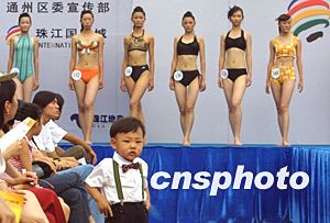 百余名泳装佳丽竞相登场。一名观众席上的小帅哥跃跃欲试当众摆出潇洒姿势。