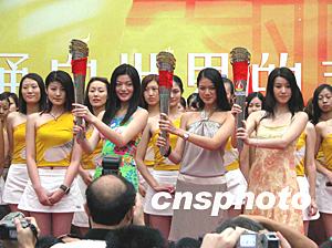 “时尚杭州之旅·2003新丝路世界模特大赛”将于今年10月28日在浙江杭州举行,此次赛事是中国首次举办的国际级模特大赛。图为二十八日在北京的发布会上,名模李冰(左二)等前来助兴。